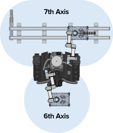 七軸機(jī)器人則安裝于直線軌道或?qū)к壪到y(tǒng)上,從而具備額外的自由度。因此,七軸機(jī)器人除擁有六軸機(jī)器人所具備的全部活動能力與靈活性之外,還能沿著直線軌道作水平或垂直運(yùn)動。這一附加軸大大擴(kuò)展了機(jī)器人的功能和工作范圍,使其能接近多個工位或覆蓋更遠(yuǎn)距離,而無需重新定位。
